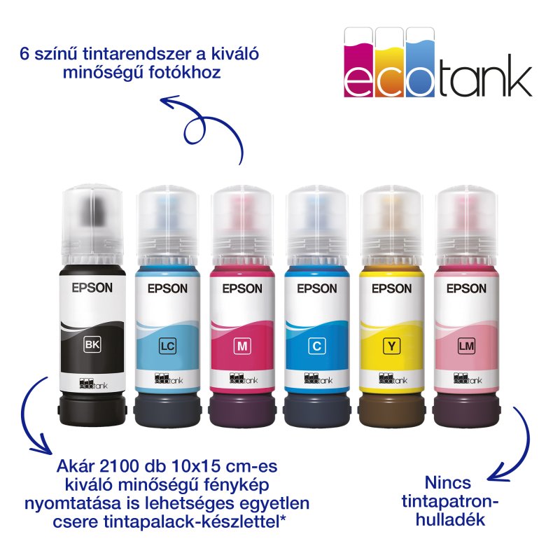 | A csomag tartalma | 6 db 70 ml-es, színenként cserélhető tintatartó palack (Bk,C,Y,M,Lc,LM), Driver and Utilities (CD), Készülék, Tápkábel, Beállítási utasítás, Garancia dokumentum |