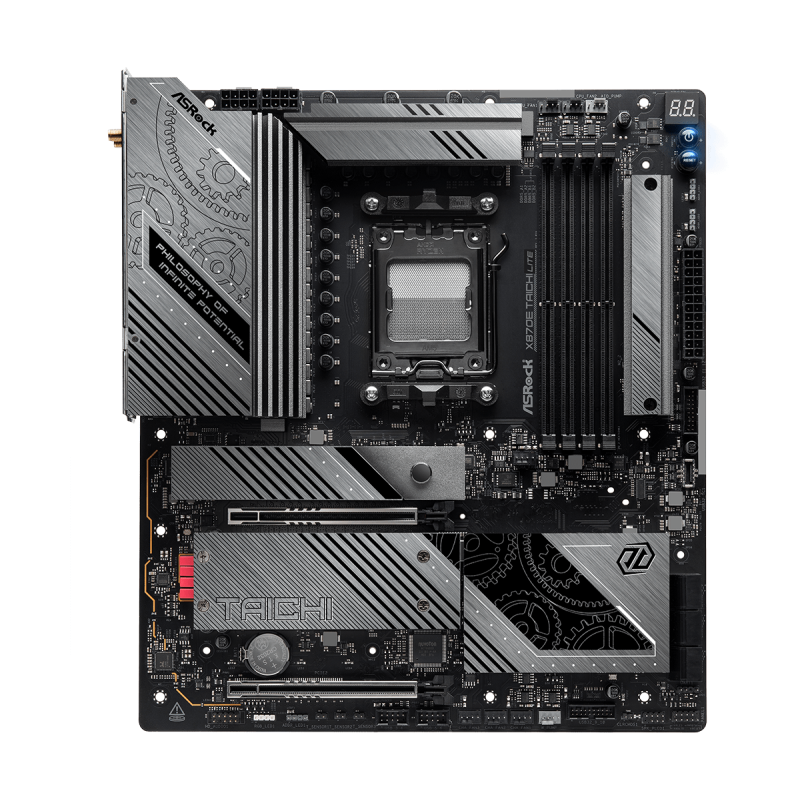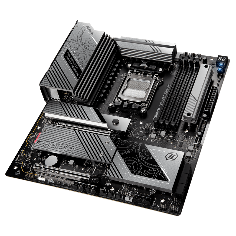 EATX, AMD X870E chipset, AM5 foglalat, AMD Ryzen™ 9000, 8000 és 7000 generációs processzor támogatás, 4db DDR5 8200+(OC) MHz memória, Wi-Fi 7, Bluetooth v5.4
