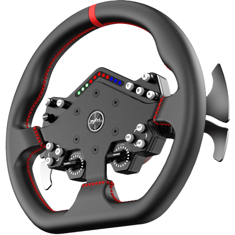 A PXN W DS R2 egy professzionális, 300 mm átmérőjű, gyorskioldós (quick-release) kormánymodul, ultramikroszálas bőr borítással, 13 programozható gombbal, RGB fordulatszám-jelző LED-ekkel és precíz Hall-effektusú váltófülekkel — ideális komoly szimulátoros versenyzéshez PC-n