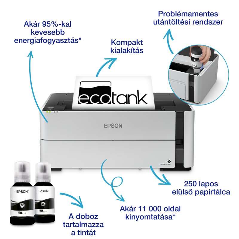 Wi-Fi csatlakoztathatósággal rendelkező, fekete-fehér EcoTank üzleti nyomtató rendkívül alacsony teljes üzemeltetési költséggel (TCO-mutatóval), felhasználóbarát elegáns és kompakt kialakítással. Akár 11 000 oldal nyomtatása a mellékelt tintatartállyal, a palack lehetővé teszi a problémamentes és egyszerű újratöltést. A Wi-Fi-, USB- és Ethernet-csatlakoztathatóság, a PCL támogatás és a gyors, hat másodperces FPOT (az első oldal elkészülésének ideje) segítségével növelheti a teljesítményt.