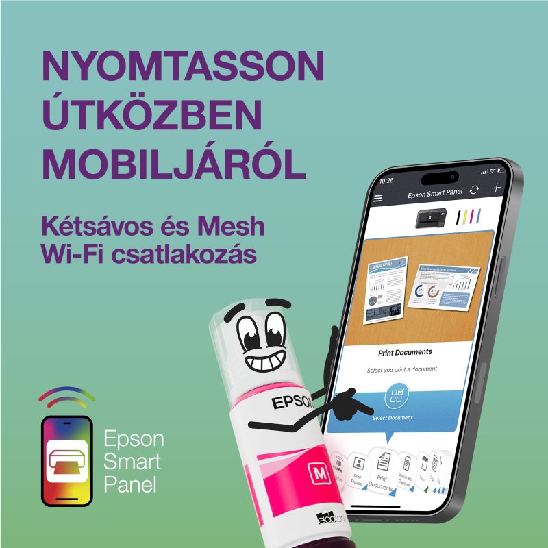 - A megbízható vezeték nélküli és vezetékes kapcsolatnak köszönhetően bárhonnan nyomtathat Használja az Epson Smart Panel alkalmazást a mobiljáról történő beállításhoz, felügyelethez, nyomtatáshoz és még sok máshoz