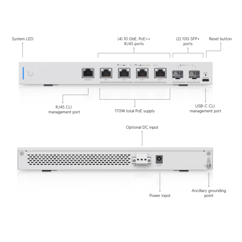 6 portos, Layer 3, PoE kapcsoló 4 x 10 GbE, PoE++ RJ45 porttal és 2 x 10G SFP+ porttal.